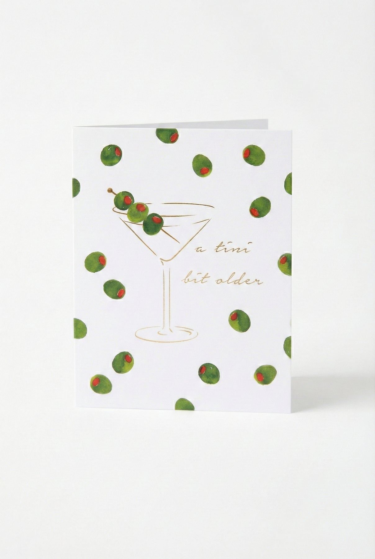 Raise a glass to another fabulous year with our A Tini Bit Older Birthday Card. Featuring hand-painted watercolor olives and a foiled martini glass, this playful design is finished with luxe gold foil lettering. Perfect for the friend who appreciates a good cocktail and an even better laugh.