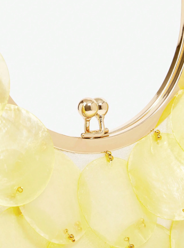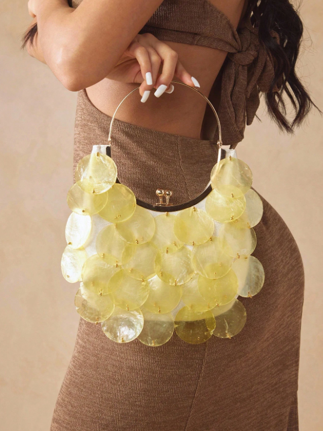 The Marée Sequin Mini Bag is part sculpture, part siren call. Designed with layered iridescent discs that mimic glistening sea glass and finished with a luxe gold-tone kiss-lock handle, this bag is pure coastal couture. It swings delicately from your wrist, catching the light and every eye in the room.