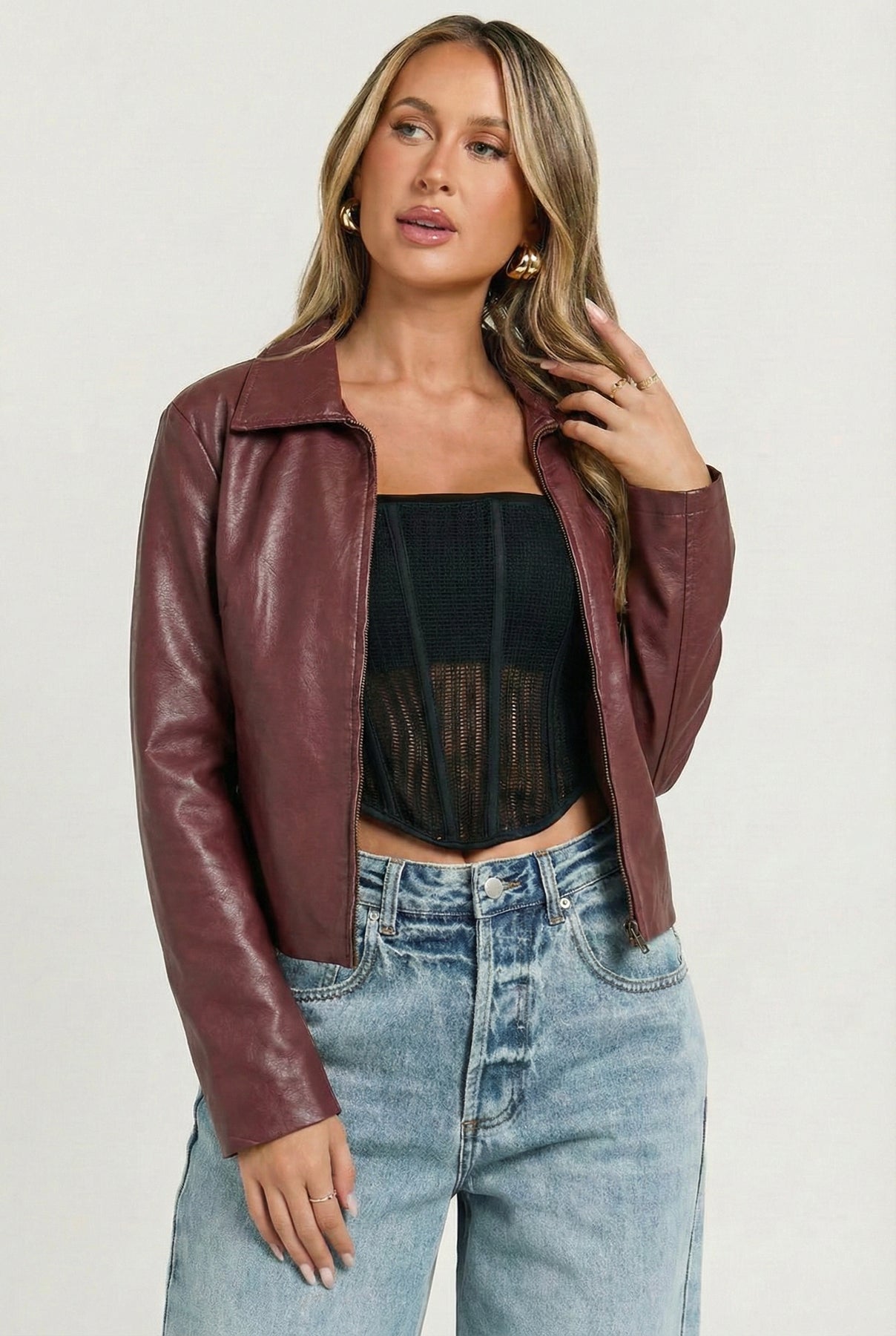 Meet your new statement layer. The Burgundy Washed Faux Leather Jacket combines a buttery-soft vegan leather feel with a relaxed, slightly boxy silhouette that’s effortlessly cool. The deep washed burgundy tone adds warmth and sophistication, while the notched collar and sleek zipper closure keep things classic. Fully lined for comfort, it pairs perfectly with mini skirts, denim, or over slip dresses for that lived-in luxe look.