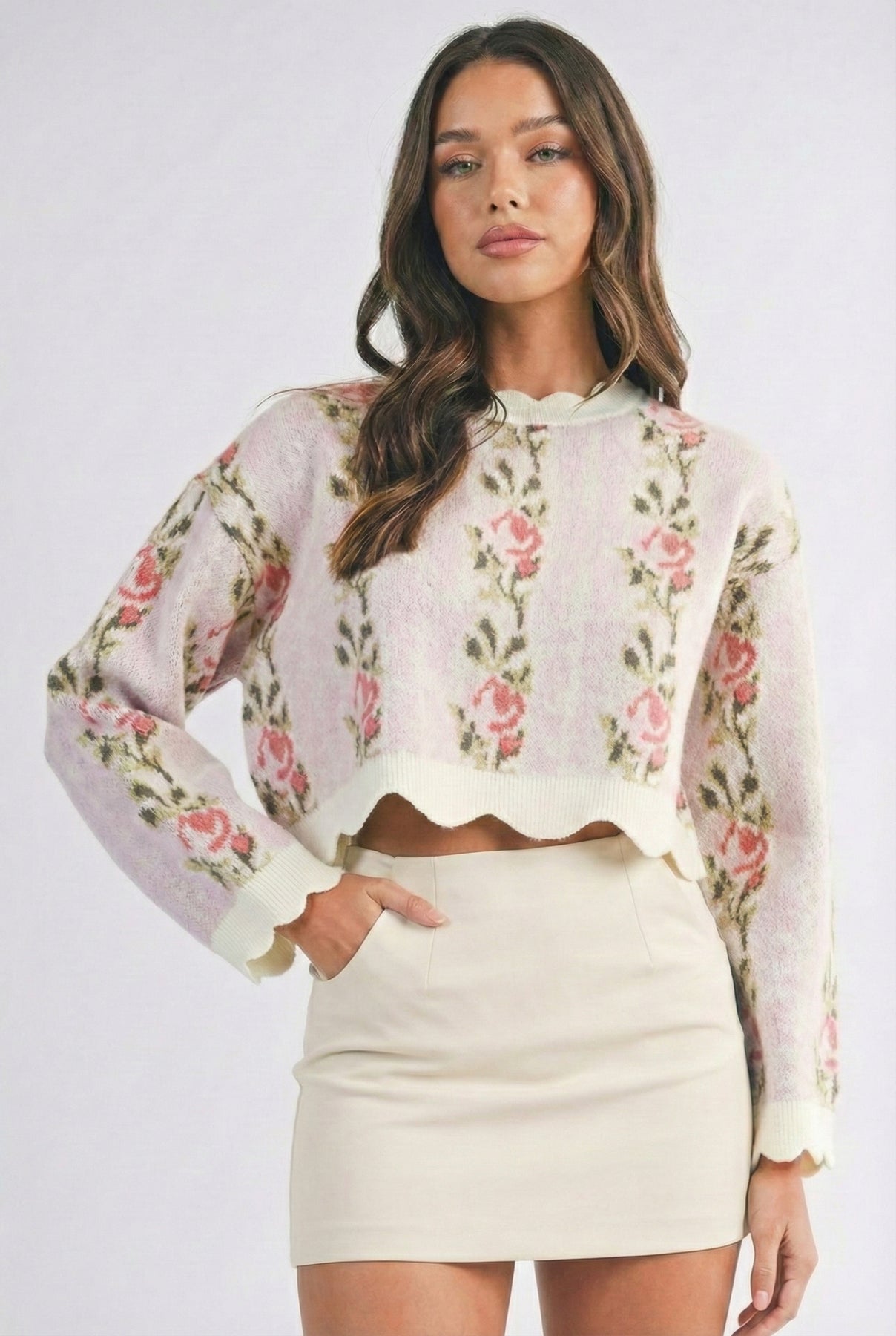 Romantic, delicate, and designed to charm — the Fleurora Pullover Knit Sweater is your go-to knit for days when you want cozy to feel like couture. Featuring soft jacquard florals in pastel hues, a scalloped neckline and hem, and a cropped silhouette, this sweater channels effortless vintage femininity. Pair it with high-rise denim or a silky skirt for a modern take on timeless romance.