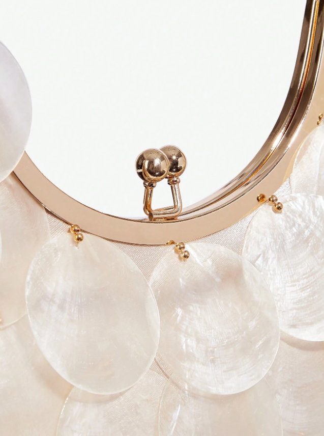 The Marée Sequin Mini Bag is part sculpture, part siren call. Designed with layered iridescent discs that mimic glistening sea glass and finished with a luxe gold-tone kiss-lock handle, this bag is pure coastal couture. It swings delicately from your wrist, catching the light and every eye in the room.
