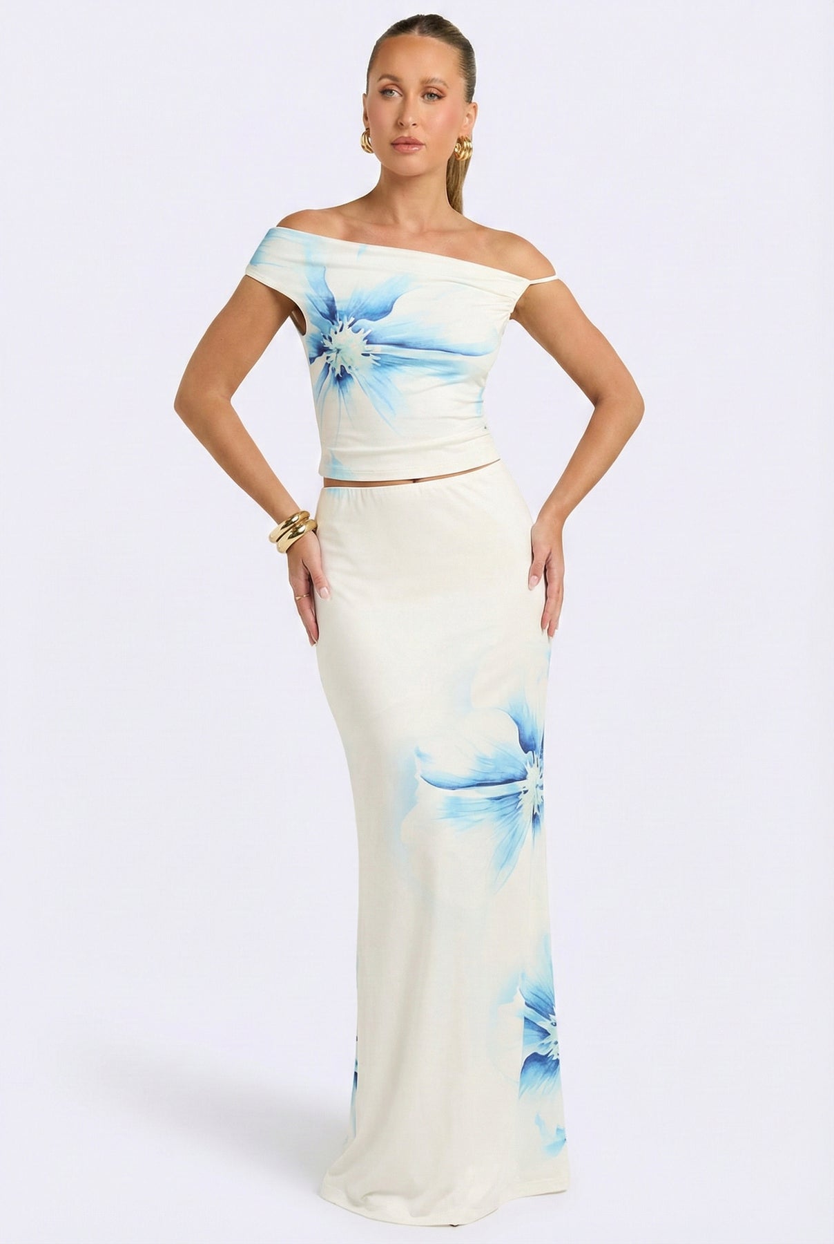 Feel effortlessly romantic in our ivory off-shoulder top. With its soft, relaxed fit and delicate watercolor blue floral print, this top brings a touch of seaside charm to your look. It’s designed to capture that carefree, breezy vibe—ideal for a sunny day by the water or a casual brunch with friends. The gentle hues and timeless style make it a versatile piece that effortlessly elevates your everyday wardrobe.