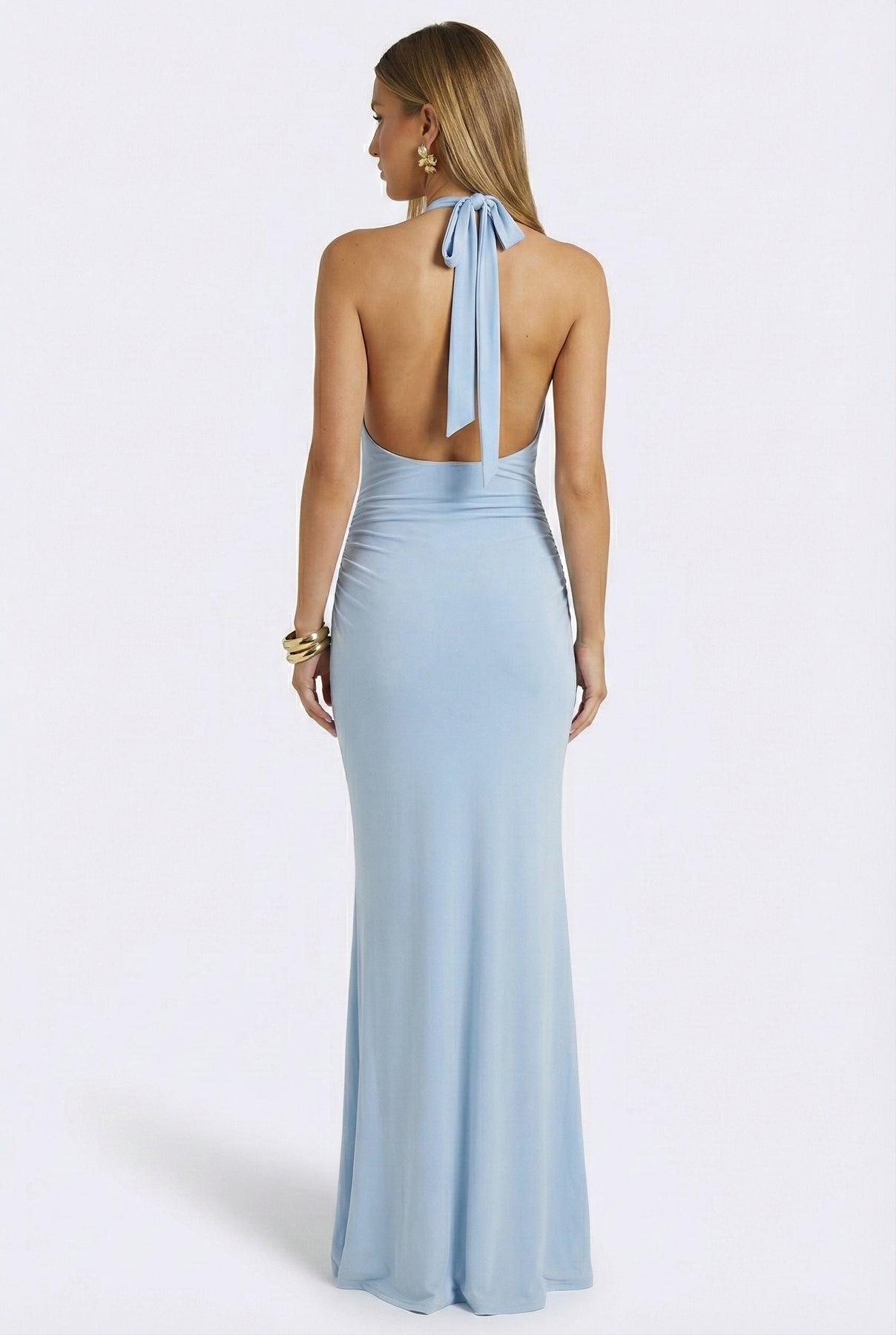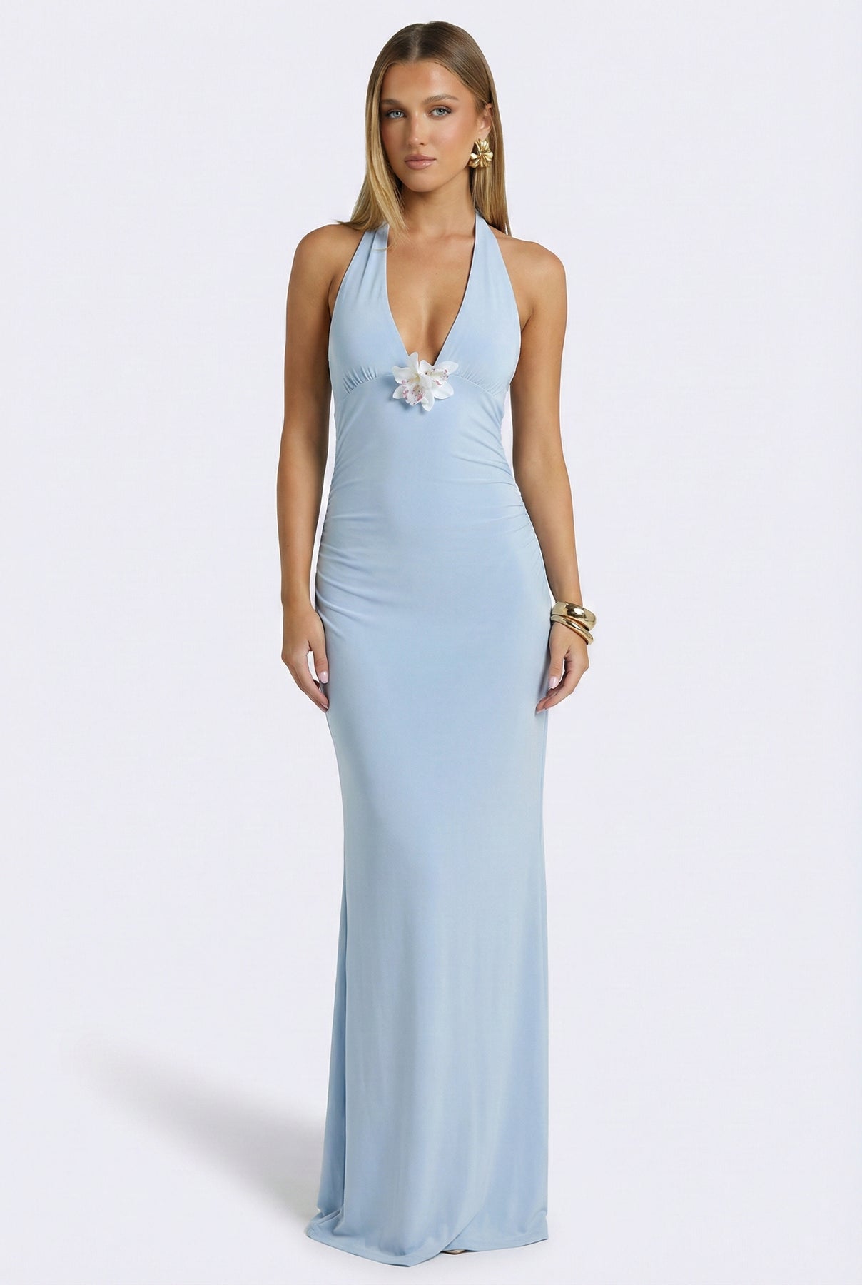 Soft sky blue meets dreamy detailing. The Sky Orchid Halter Maxi Dress features a plunging V-neckline with a delicate orchid appliqué and a self-tie halter back that flatters from every angle. Cut from fluid stretch satin, it drapes beautifully over the body — perfect for a day event, beach dinner, or evening out. Feminine, fresh, and meant to be seen in sunlight.