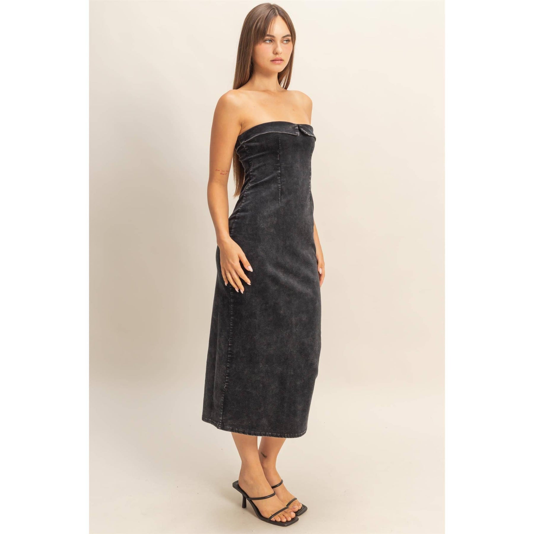 Sultry meets sophisticated in the Mineral Muse Strapless Midi Dress, designed with a mineral-washed finish that feels both modern and lived-in. Its structured bodice shapes and supports, while a subtle hem slit adds just the right amount of movement. Whether you’re styling it with heels for a night out or flats for daytime edge, this curve-hugging silhouette is ready to impress.