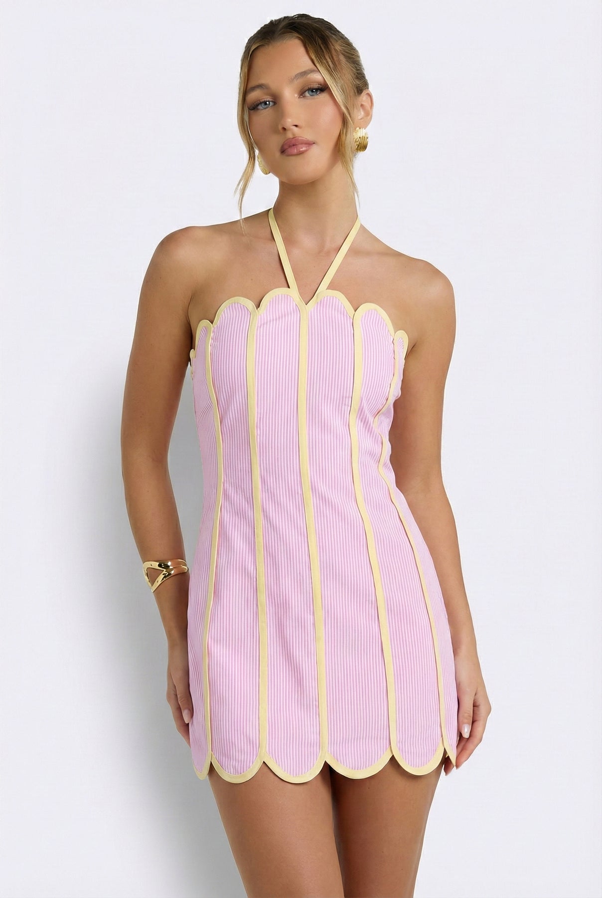 A little flirty, a little tailored, and exactly the kind of mini that makes people stop mid-scroll. The soft vertical stripe paired with contrast scalloped piping creates that sculpted, feminine shape Lithologie girls always reach for — playful but polished enough for dinner, parties, or a last-minute vacation look.